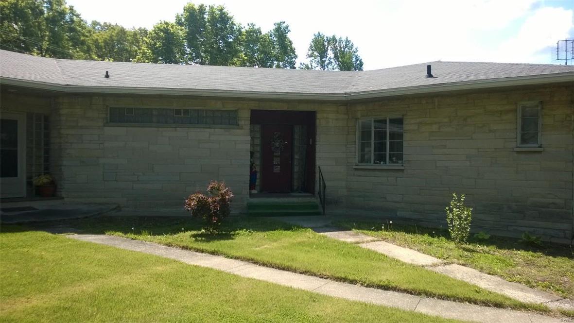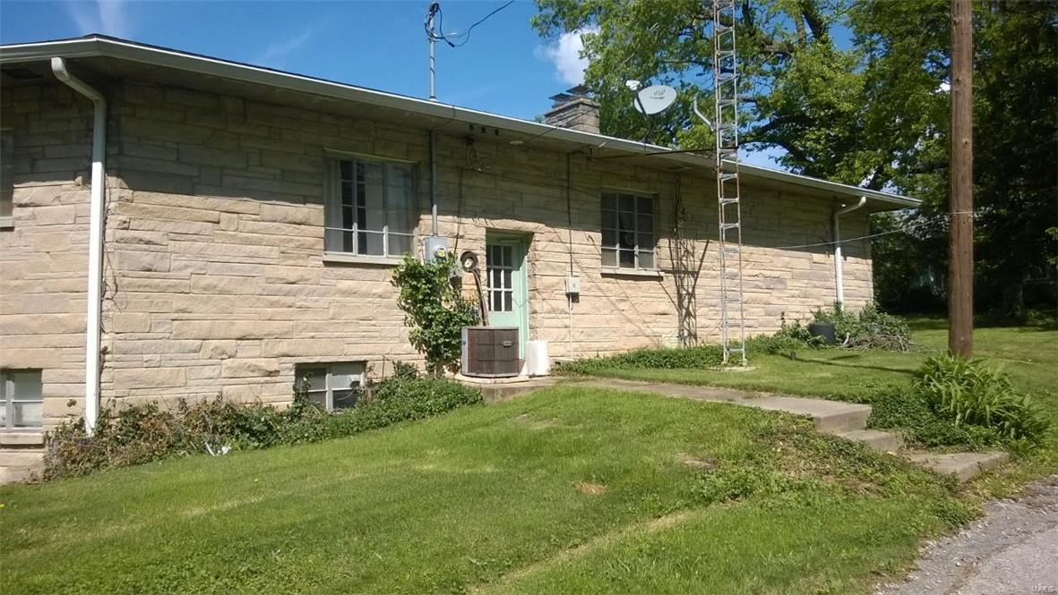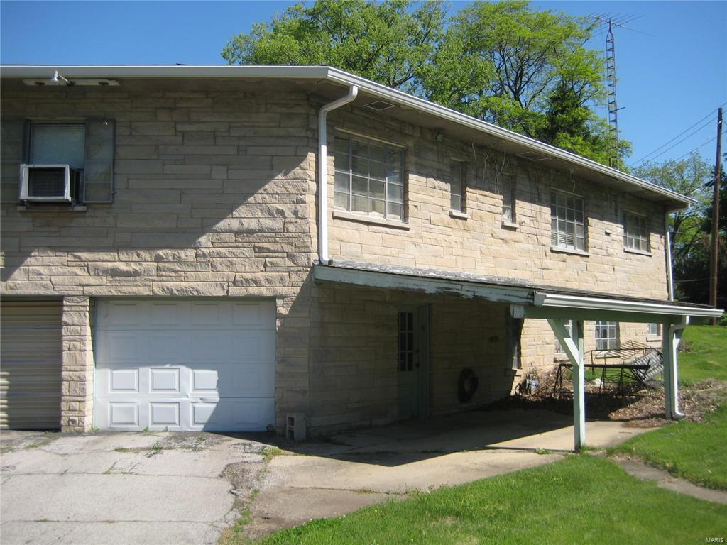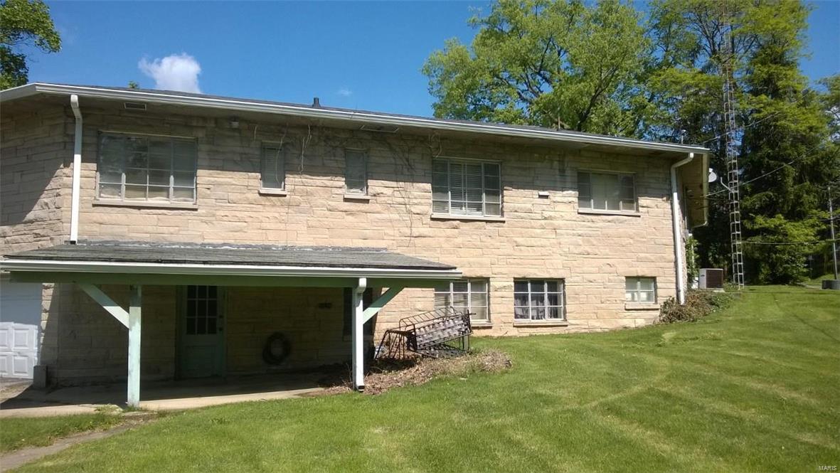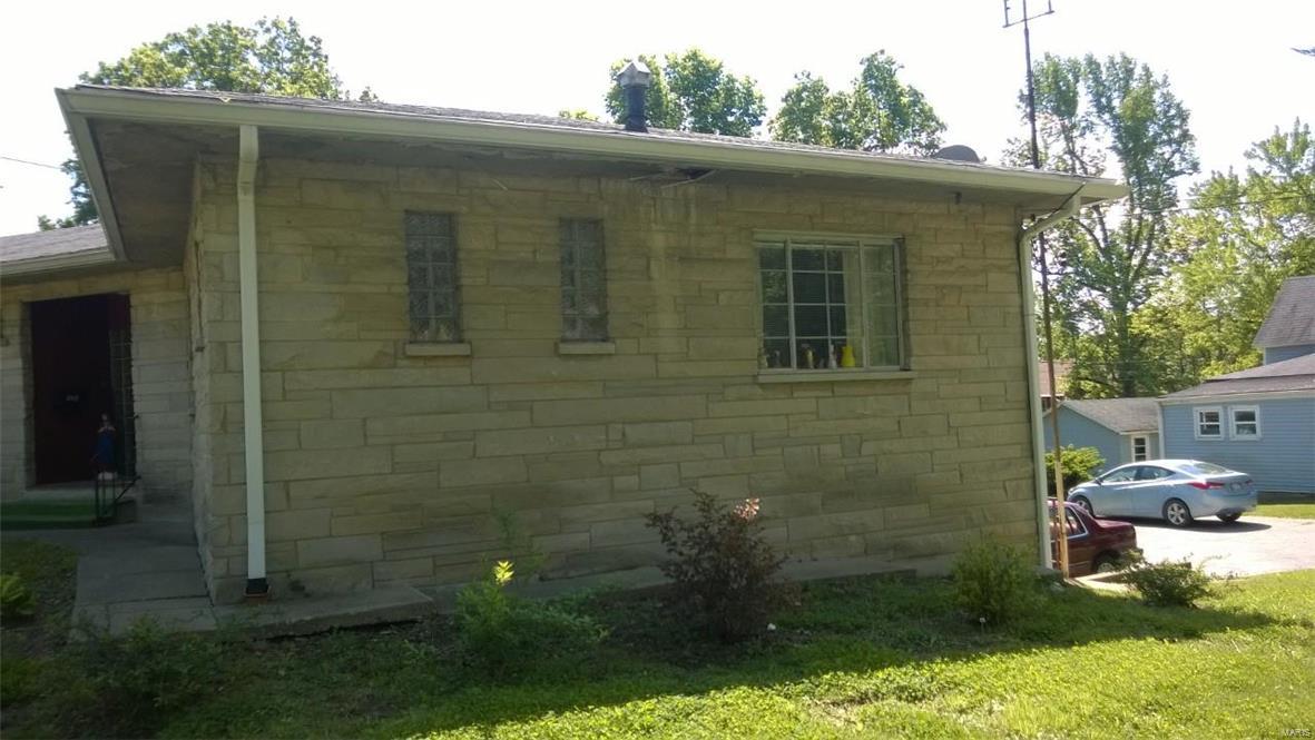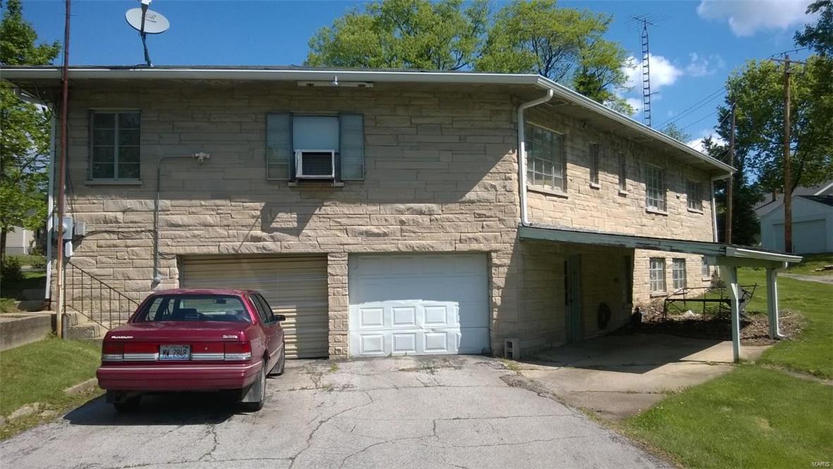 Unique stone home on large corner lot near Greenville College. Property is currently used as a duplex but can easily be converted to a single family residence with the removal of one door. East side of duplex has large living area that opens to a dining/kitchen combo. Large windows and a floor to ceiling stone fireplace. A large master suite with corner tub/shower complete the main floor. The basement features a family room, laundry area and large storage area as well as a one car garage. West side has two bedrooms with a jack-n-jill bathroom between them as well as a living, kitchen and separate dining. One car garage in the basement as well with access from the outside only. West side is very dated but solidly built and ready to be updated. East side has been updated. House sits on three lots and has extra parking areas, one carport space and an outdoor stone grill/fireplace with patio.