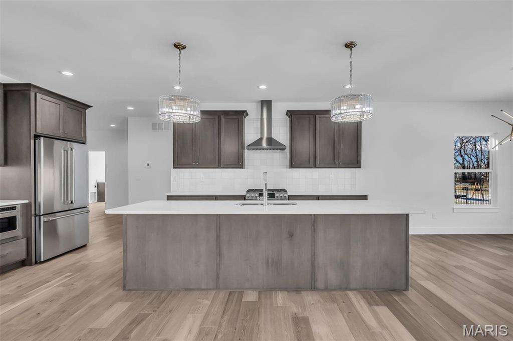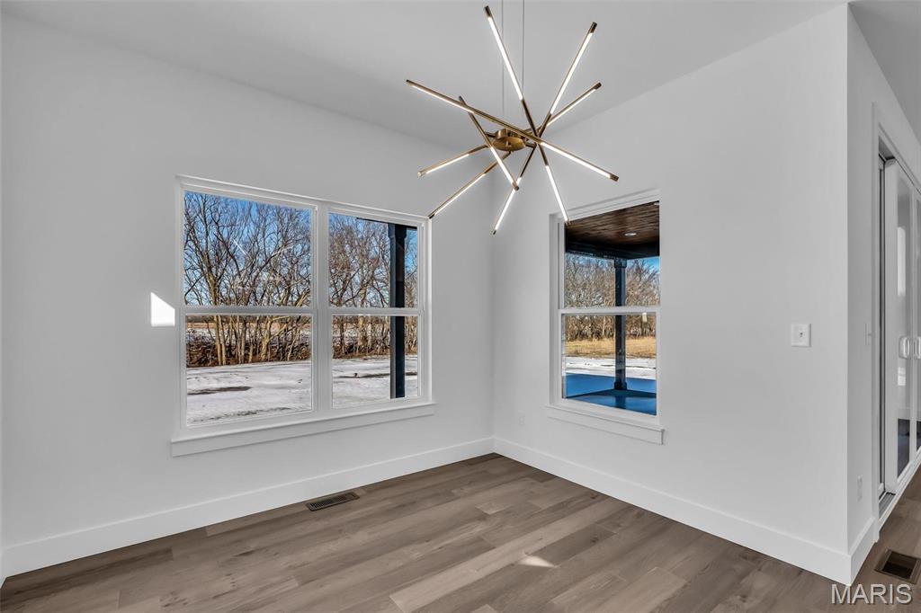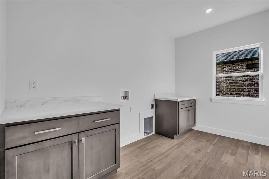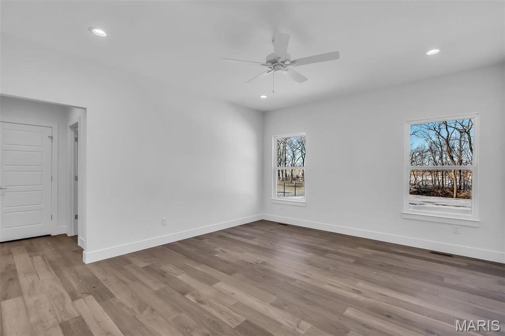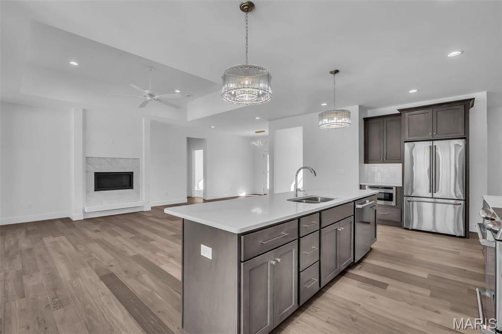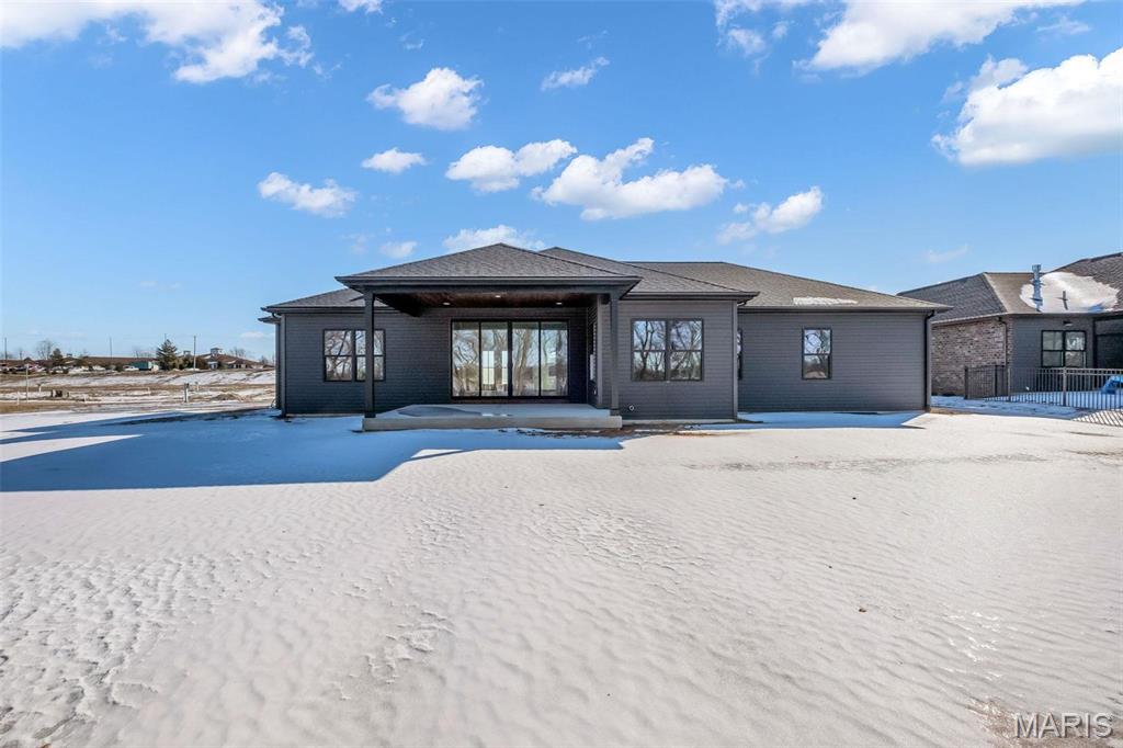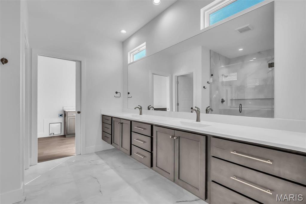 3 car garage, 3 bedrooms, 2.5 bathrooms The large open floor plan combines the great room and kitchen with an eat-in dining/breakfast room with a modern edge (engineered hardwood). Stainless Cafe appliances include a gas range (hood vent), double-door refrigerator, drawer microwave, and dishwasher. Aspect custom cabinets with Cambria countertops. Gas fireplace with tiled surround and modern hearth Large primary suite with engineered hardwood throughout. The primary suite has a large custom walk-in closet adjacent to the master bathroom. This large primary bathroom boasts a modern floating double vanity and a large double-head custom tile shower. Laundry room off the primary with drop zone entry from the garage. J & J guest bedrooms have a tiled bathroom, a separate water closet, and a shower/tub combo from the double vanity space. Brand new sod in the front yard and seeded back yard. Broker has agent interest with both owner & builder. GPS Friendly COOL: 14 SEER+