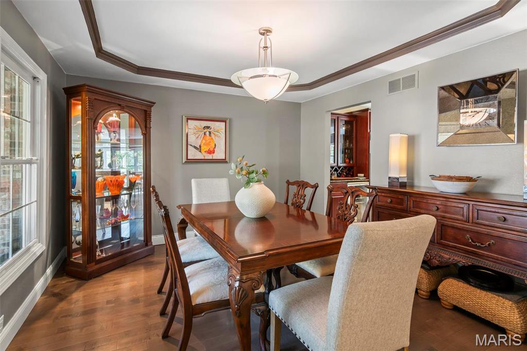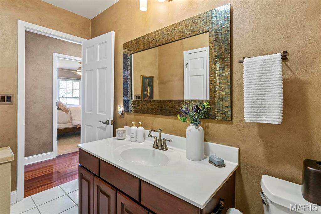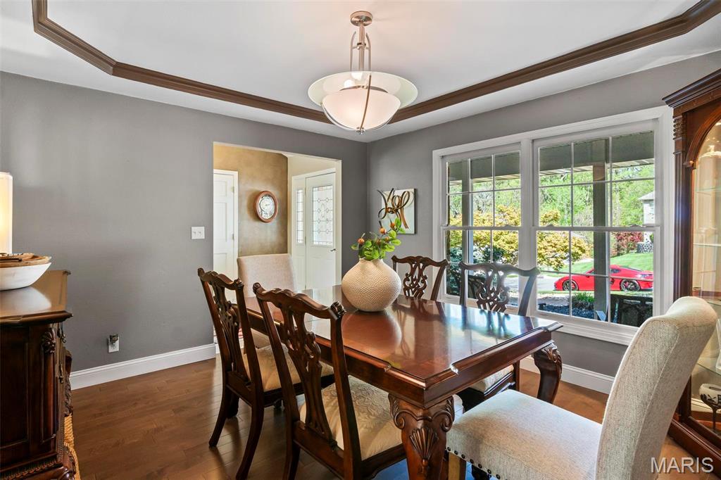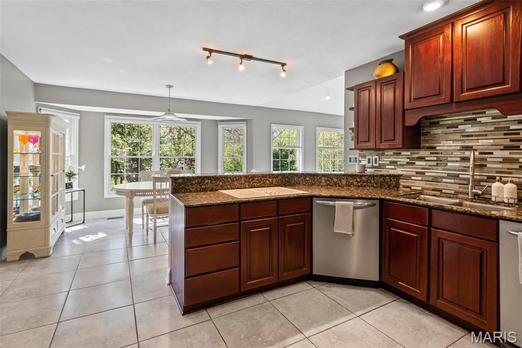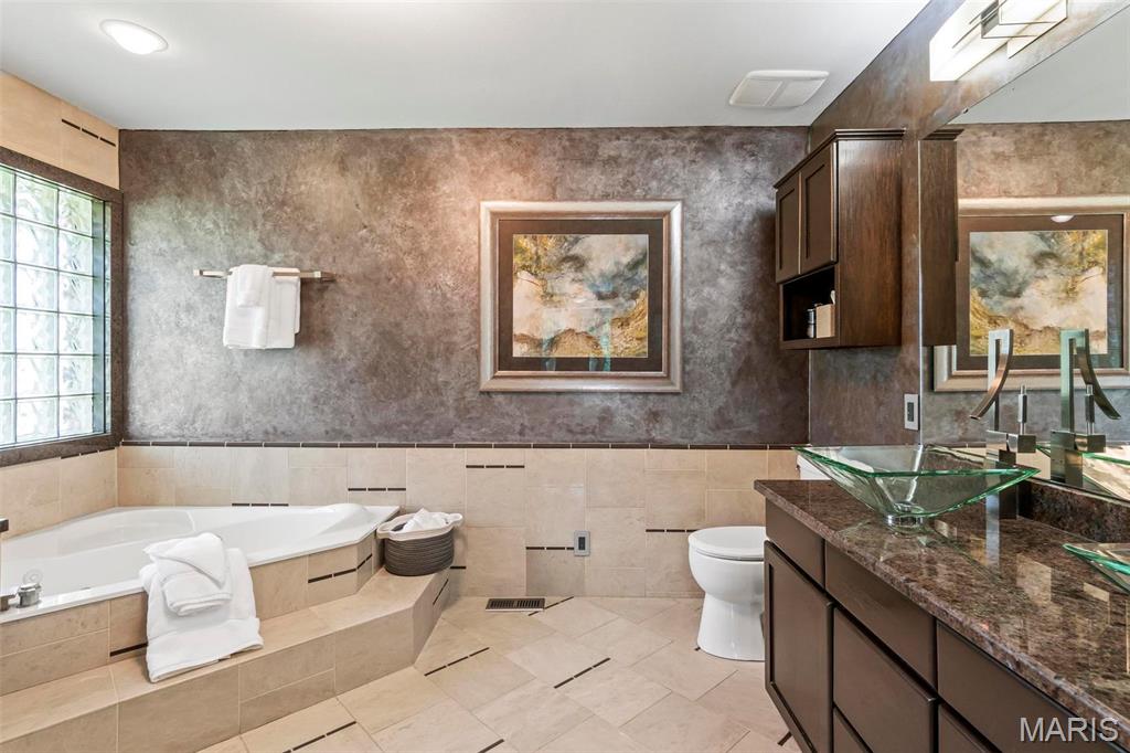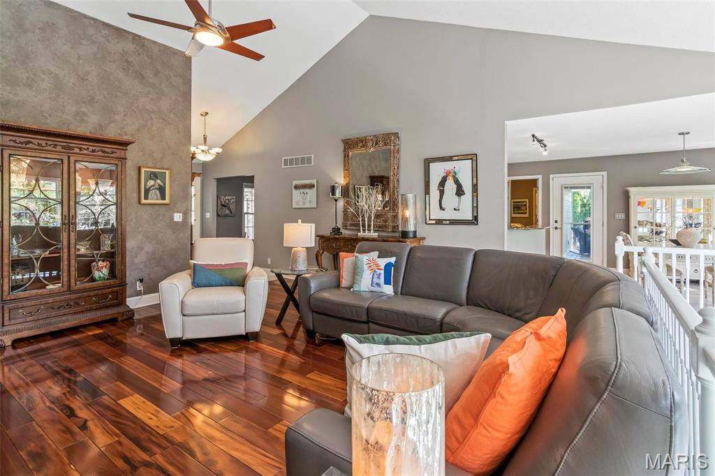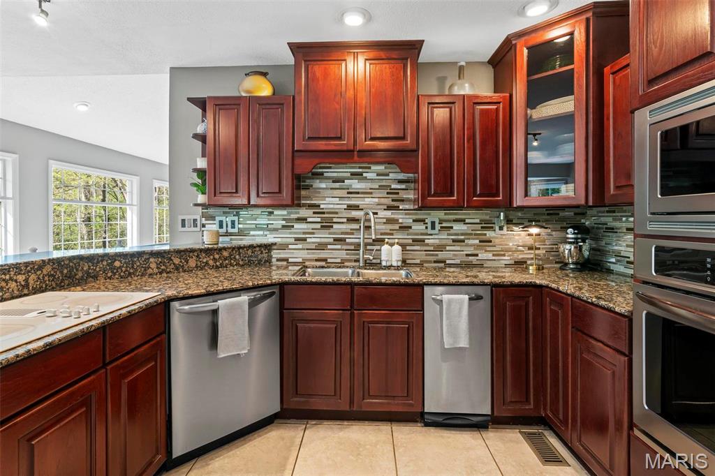 Meticulously maintained 4BD/3.5BA ranch with full walkout basement in sought-after Kingsbrooke Subdivision and Edwardsville School District. Classic, flowing floorplan with an atrium-style, light-filled great room, hardwoods, and gas fireplace. Formal dining plus a sun-filled breakfast nook. Kitchen features granite, stainless appliances, custom cabinetry, and a built-in bar for ultimate convenience. Step outside to your backyard oasis: covered deck, multiple patios, tiered gardens, and a tranquil waterfall - perfect for morning coffee or evening relaxation. Updated main-floor primary suite offers a spa-style bath with heated floors and walk-in closet. Finished walkout basement adds private guest quarters, rec space, and storage. Oversized three-car garage with low-maintenance coated floor. Professional landscaping, in-ground irrigation system, quick highway access, and shopping nearby. Strength, style, and sophistication - this home has it all.