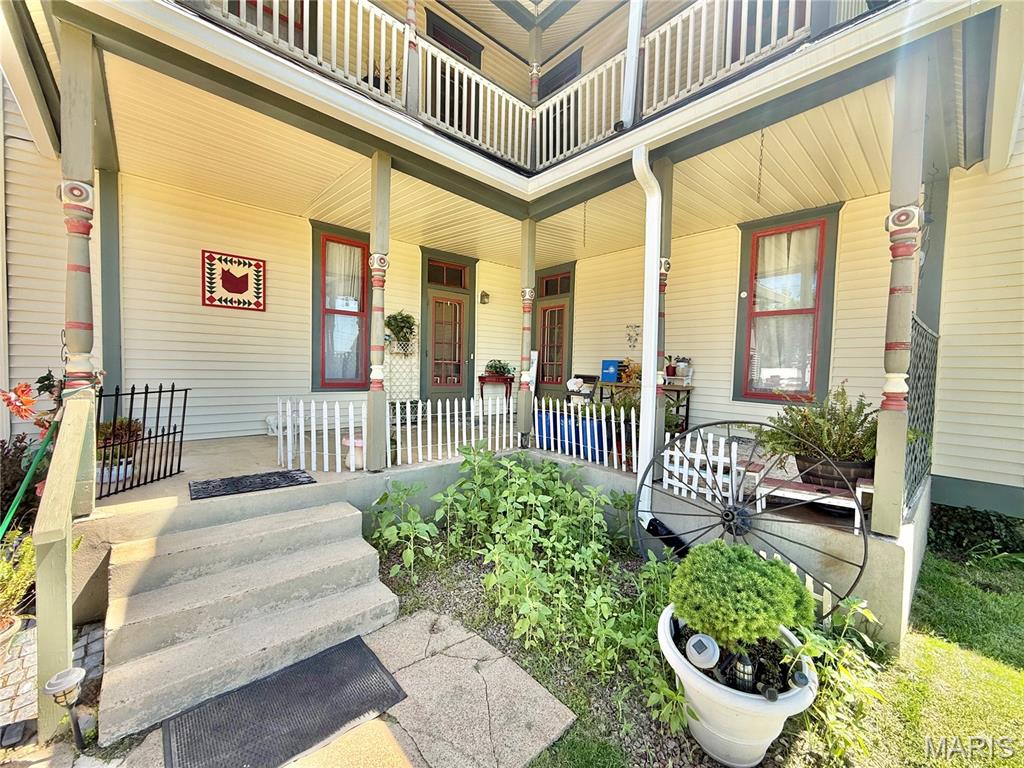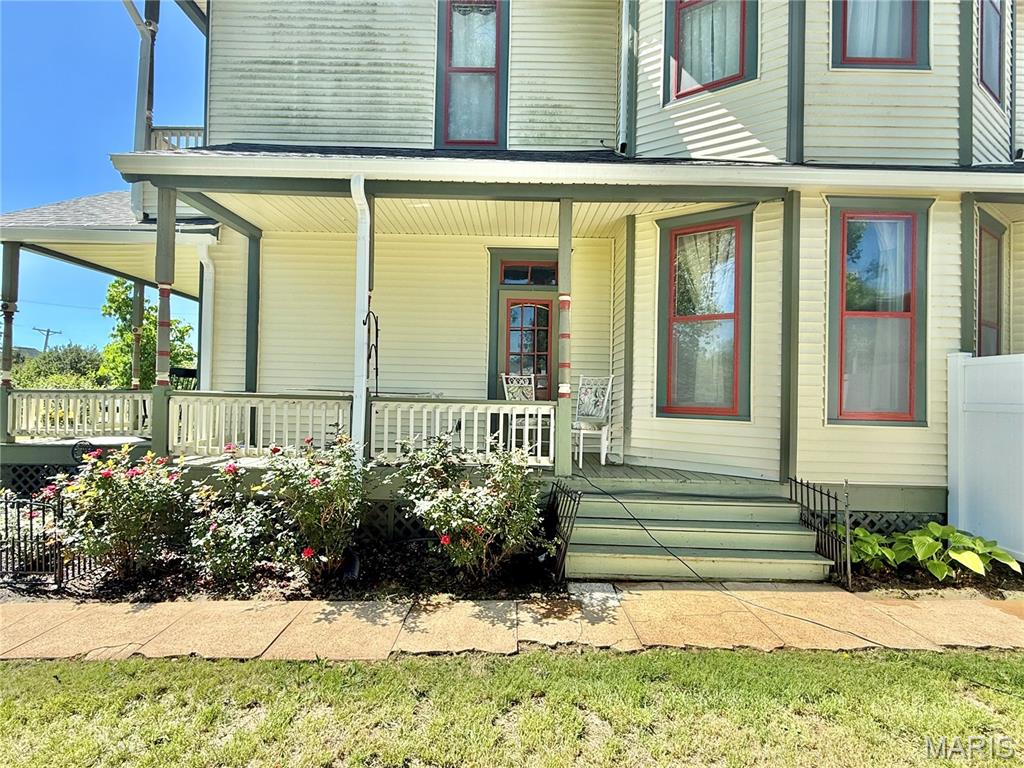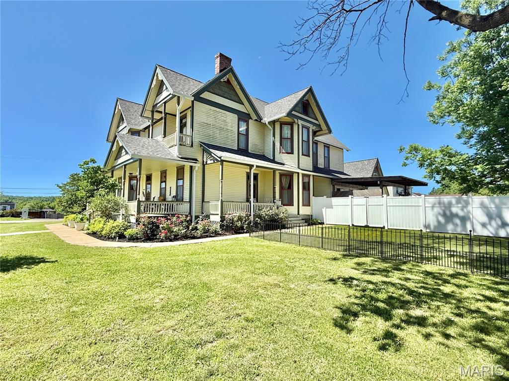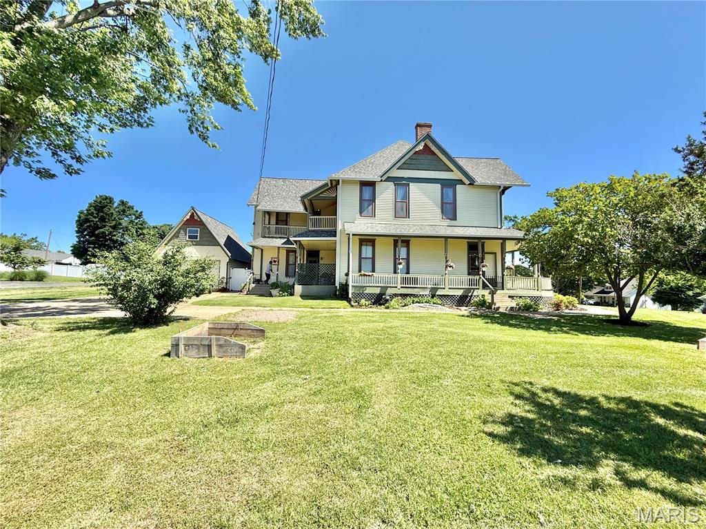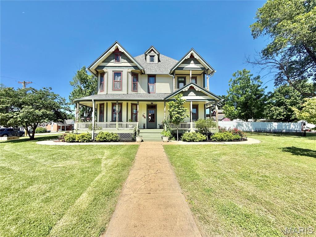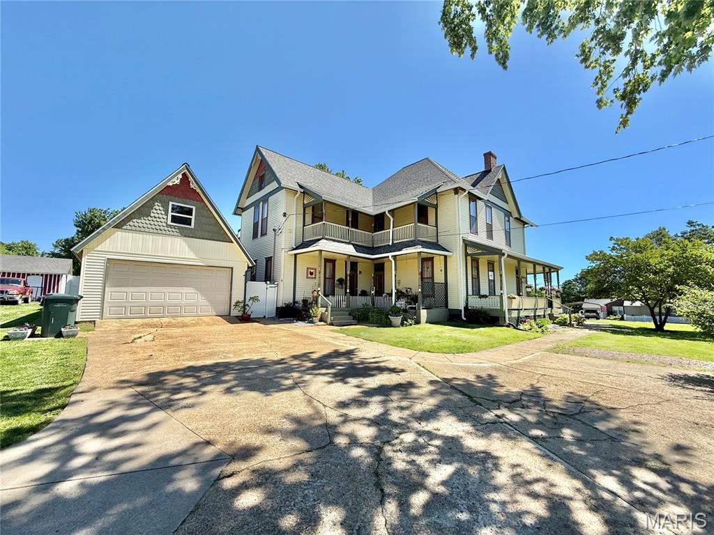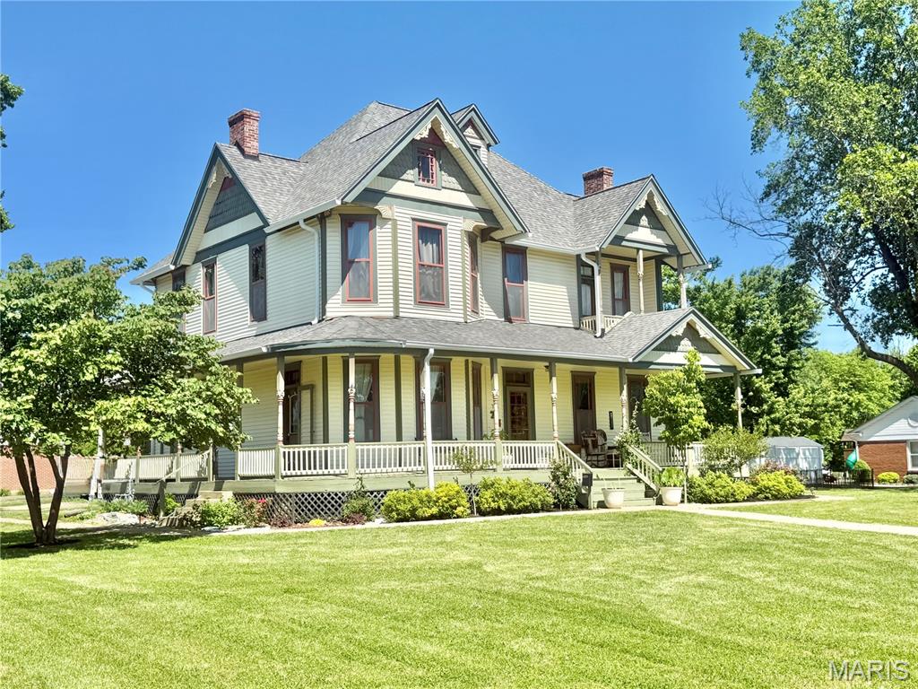 Welcome to this stunning 2-story modern Victorian home, offering timeless elegance and thoughtful updates throughout. This home features over 3500sqft of living space for you and your growing family. Step inside to discover soaring 10-foot ceilings, rich natural hardwood flooring, and exquisite crown molding in every room. The updated kitchen boasts beautiful cabinetry, a large center island, and sleek stainless-steel appliances, while the renovated bathrooms offer style and function. The Primary bedroom offers a modern updated full bath with a walk-in shower. Each spacious bedroom provides comfort and versatility for any lifestyle. Enjoy two fully functional fireplaces in the dining and sitting rooms, perfect for cozy gatherings. Outdoor living shines with a charming wrap-around porch, multiple additional porches, a second-story balcony, and a fenced backyard with a patio—ideal for privacy and entertaining. Situated on a generous 0.66+/- acre lot, there’s ample space for children, pets, or large family gatherings. The detached oversized one-car garage features additional storage in the upstairs attic. Gorgeous landscaping surrounds the home, and a basement provides extra storage or a secure storm shelter. This is truly a dream property blending classic character with modern comfort.