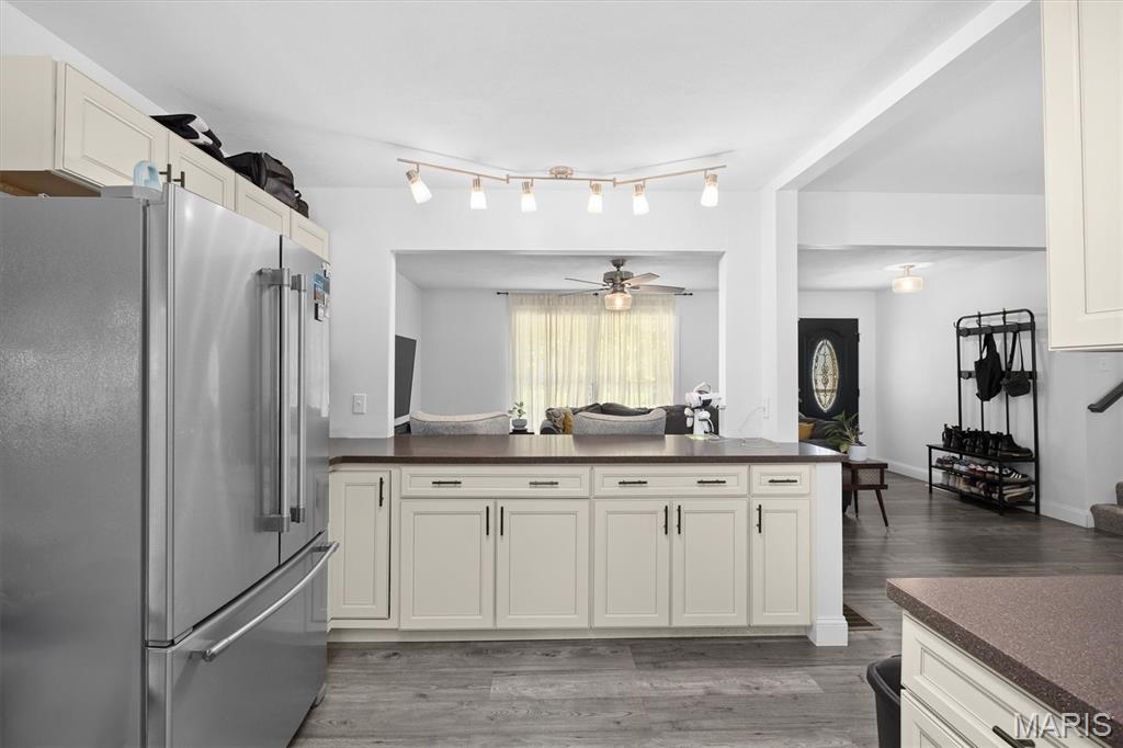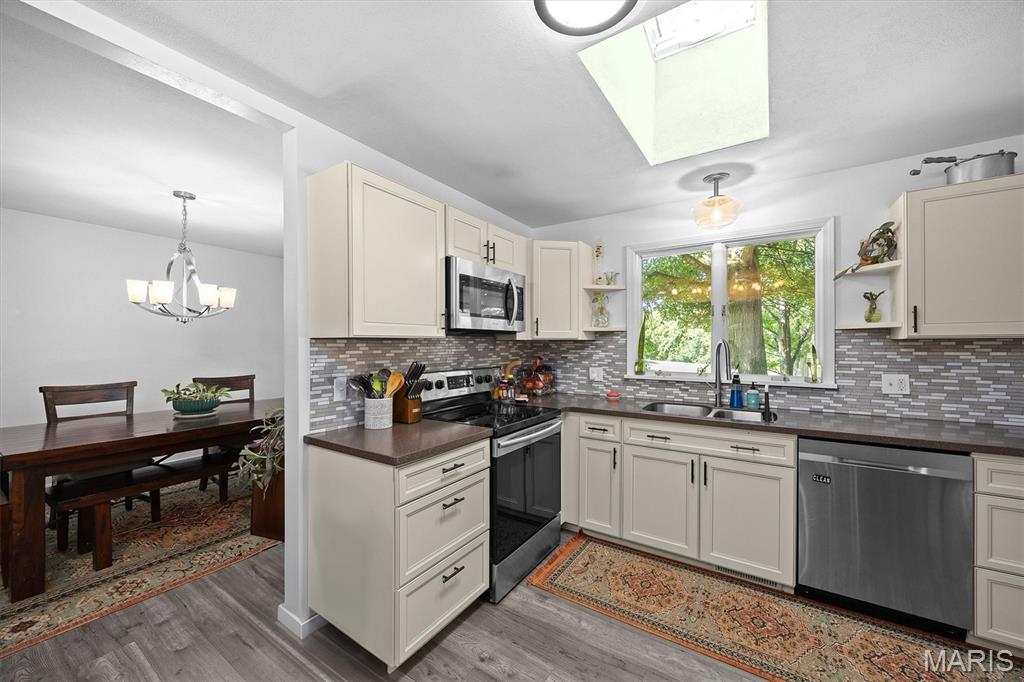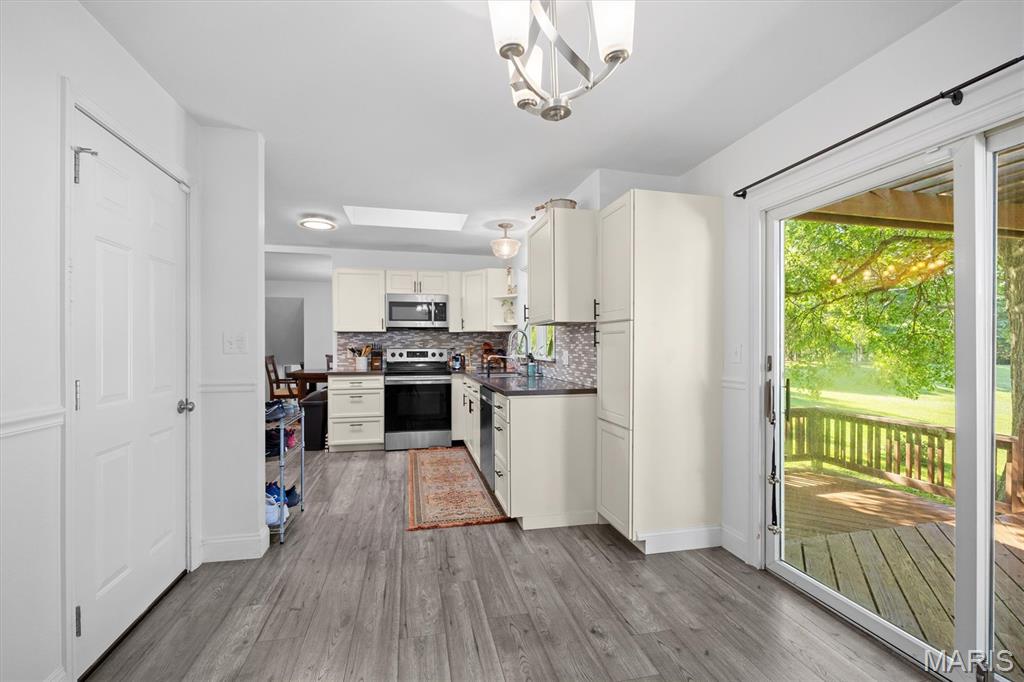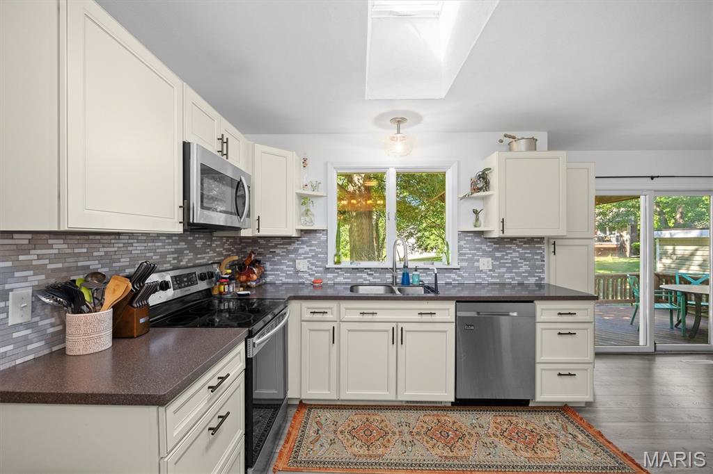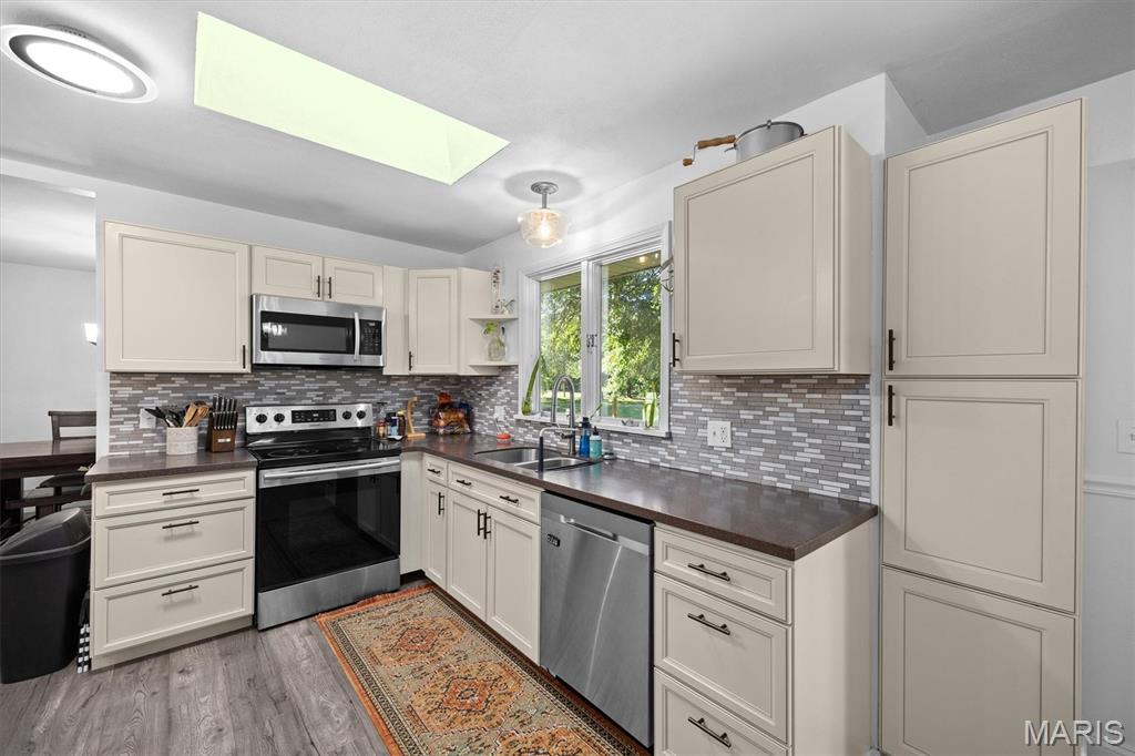 Move-In Ready with Modern Updates! This beautifully updated home offers over 2,000 sq. ft. of total living space, featuring a bright open floor plan ideal for gatherings and everyday comfort. The renovated kitchen shines with new cabinetry, tile backsplash, solid surface countertops, and stainless steel appliances—perfect for cooking and entertaining. Enjoy meals in the formal dining area or cozy breakfast nook that opens to a 22x12 deck overlooking the private backyard. Engineered wood floors run throughout the main spaces, with plush carpet in the bedrooms and new tile in the bathrooms. The primary suite includes a walk-in closet and private balcony access. Downstairs, the spacious family room opens to the backyard via a sliding glass door and includes a 4th bedroom or office and full bath with shower. The oversized garage offers a newer door and opener, utility sink, and a 10x11 workshop or storage room. Nothing to do but move in and enjoy!