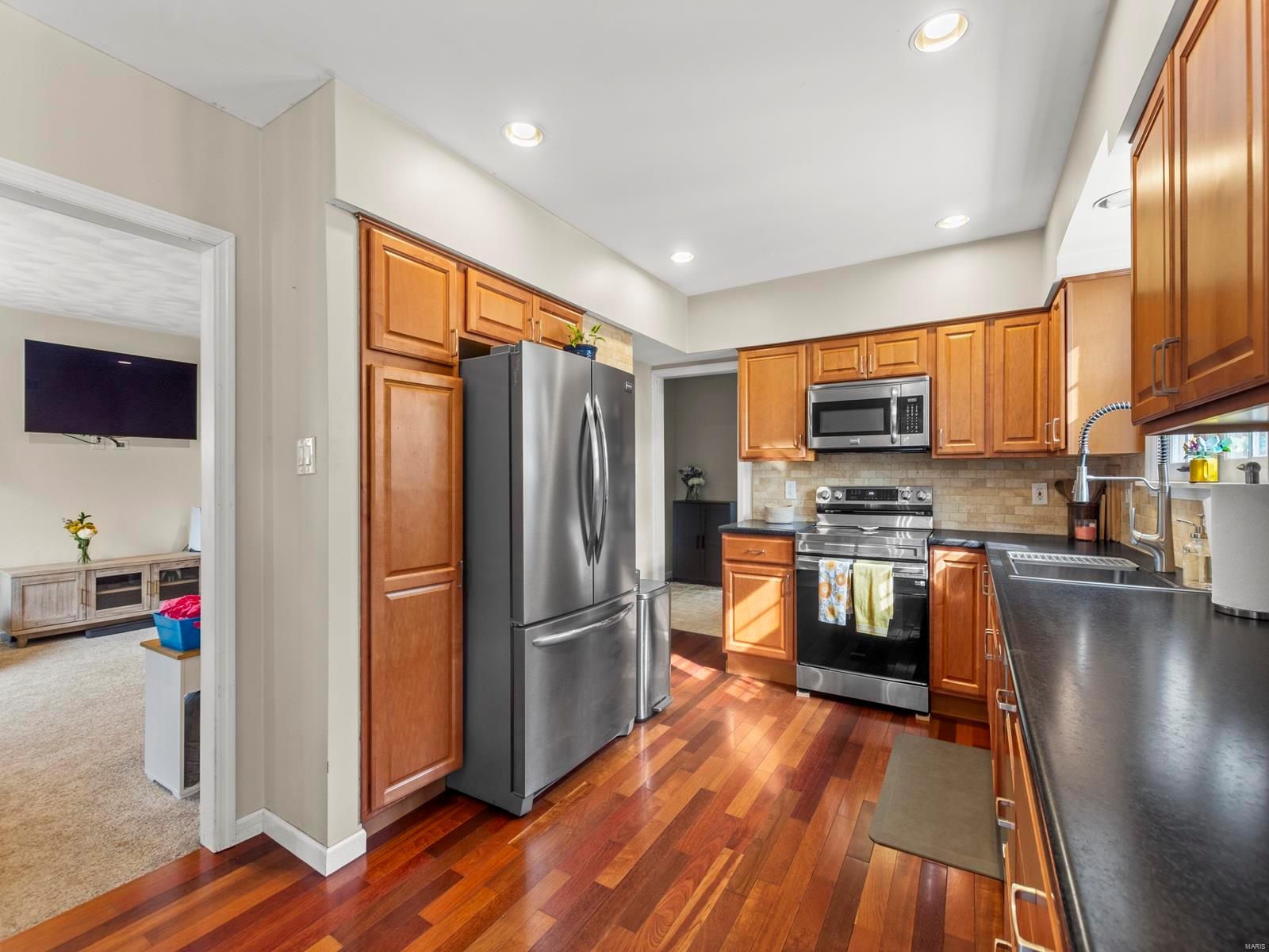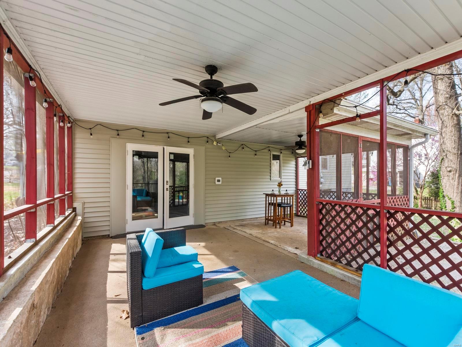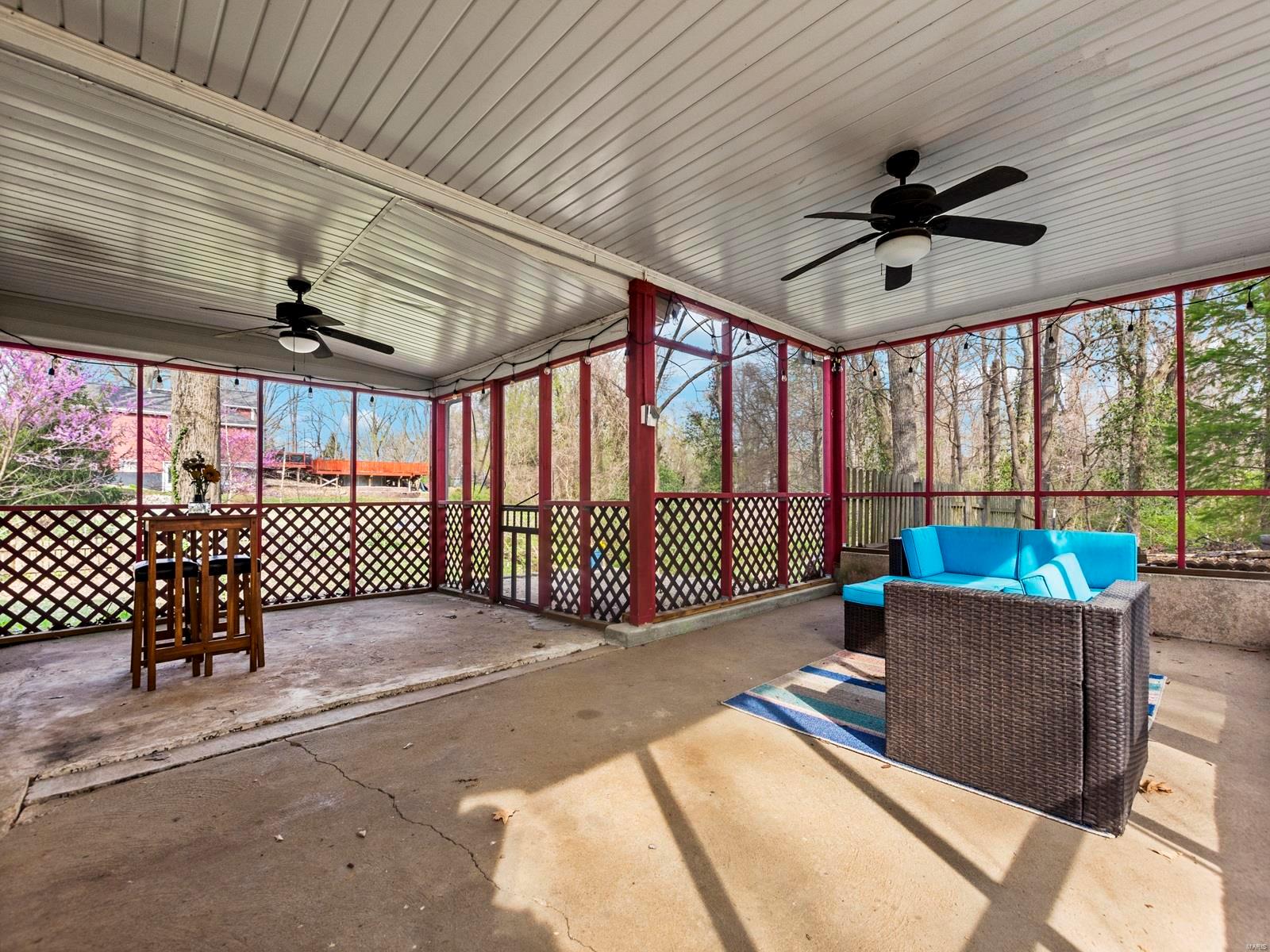 Updated Edwardsville charmer, only blocks to vibrant downtown district. Close to everything in the heart of town, but with a rural & private feel. Almost half an acre of fenced-in yard that backs up to woods. Birdwatch or entertain with a great view from the over 300+ sq ft screened-in porch. Beautifully updated kitchen with travertine tile backsplash, stainless steel appliances, & beautiful hardwood flooring. Main level primary bedroom boasts new carpet, double closets/walk-in cedar closet & updated full bath with bonus storage. 2 Large guest bedrooms upstairs & owner just uncovered original hardwood floors! Updated full bathroom, plus extra storage closets. Partially finished basement: 2 finished bonus rooms that you can customize to your needs, utility room with sink, & large storage room. Big 2-car attached garage & extra parking. New siding & roof 2024, water heater 2023, some plumbing 2023, oven 2025, kitchen sink 2024, HVAC 2018, Carpet in LR & Primary Bed 2025. Start packing!