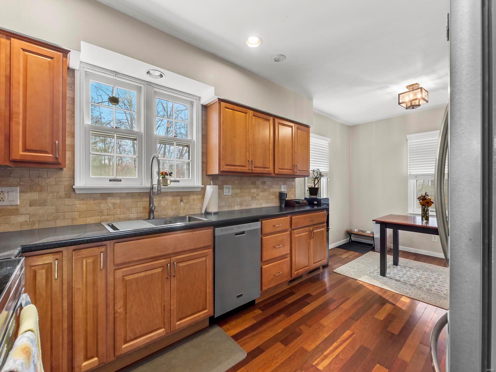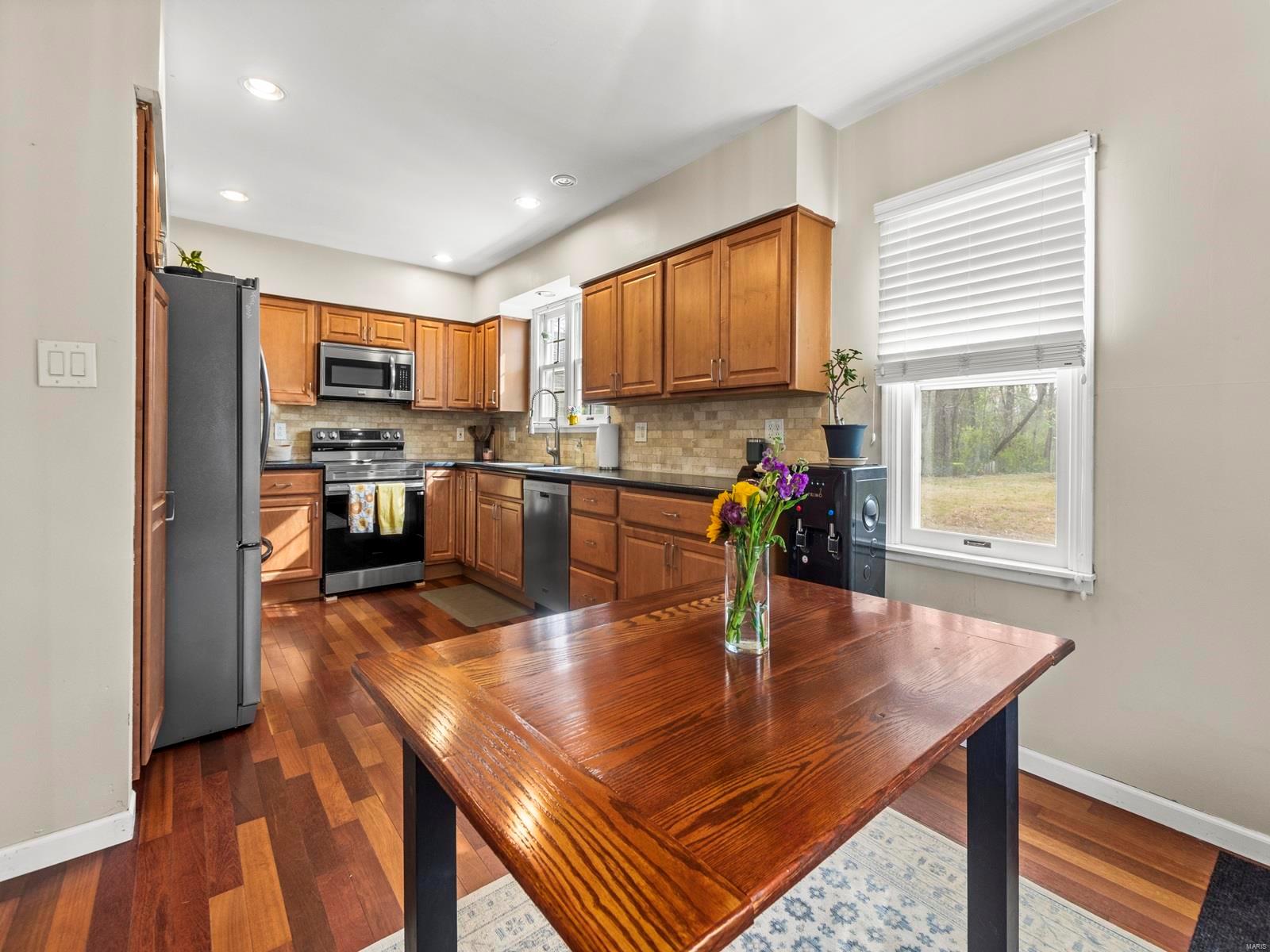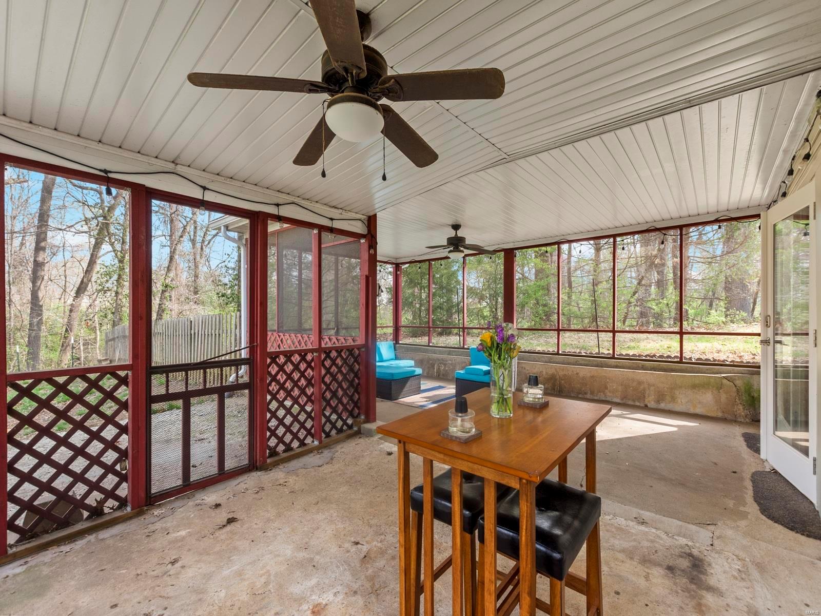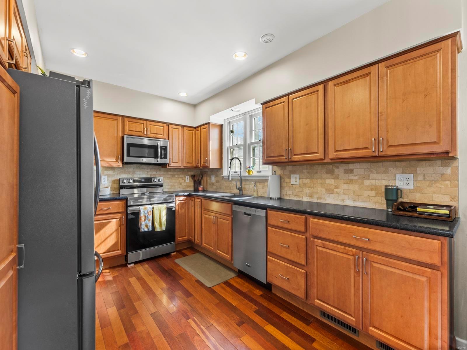 Updated Edwardsville charmer, only blocks to vibrant downtown district. Close to everything in the heart of town, but with a rural & private feel. Almost half an acre of fenced-in yard that backs up to woods. Birdwatch or entertain with a great view from the over 300+ sq ft screened-in porch. Beautifully updated kitchen with travertine tile backsplash, stainless steel appliances, & beautiful hardwood flooring. Main level primary bedroom boasts new carpet, double closets/walk-in cedar closet & updated full bath with bonus storage. 2 Large guest bedrooms upstairs & owner just uncovered original hardwood floors! Updated full bathroom, plus extra storage closets. Partially finished basement: 2 finished bonus rooms that you can customize to your needs, utility room with sink, & large storage room. Big 2-car attached garage & extra parking. New siding & roof 2024, water heater 2023, some plumbing 2023, oven 2025, kitchen sink 2024, HVAC 2018, Carpet in LR & Primary Bed 2025. Start packing!