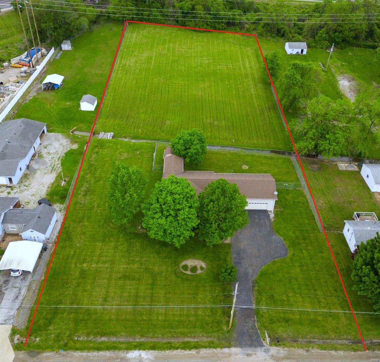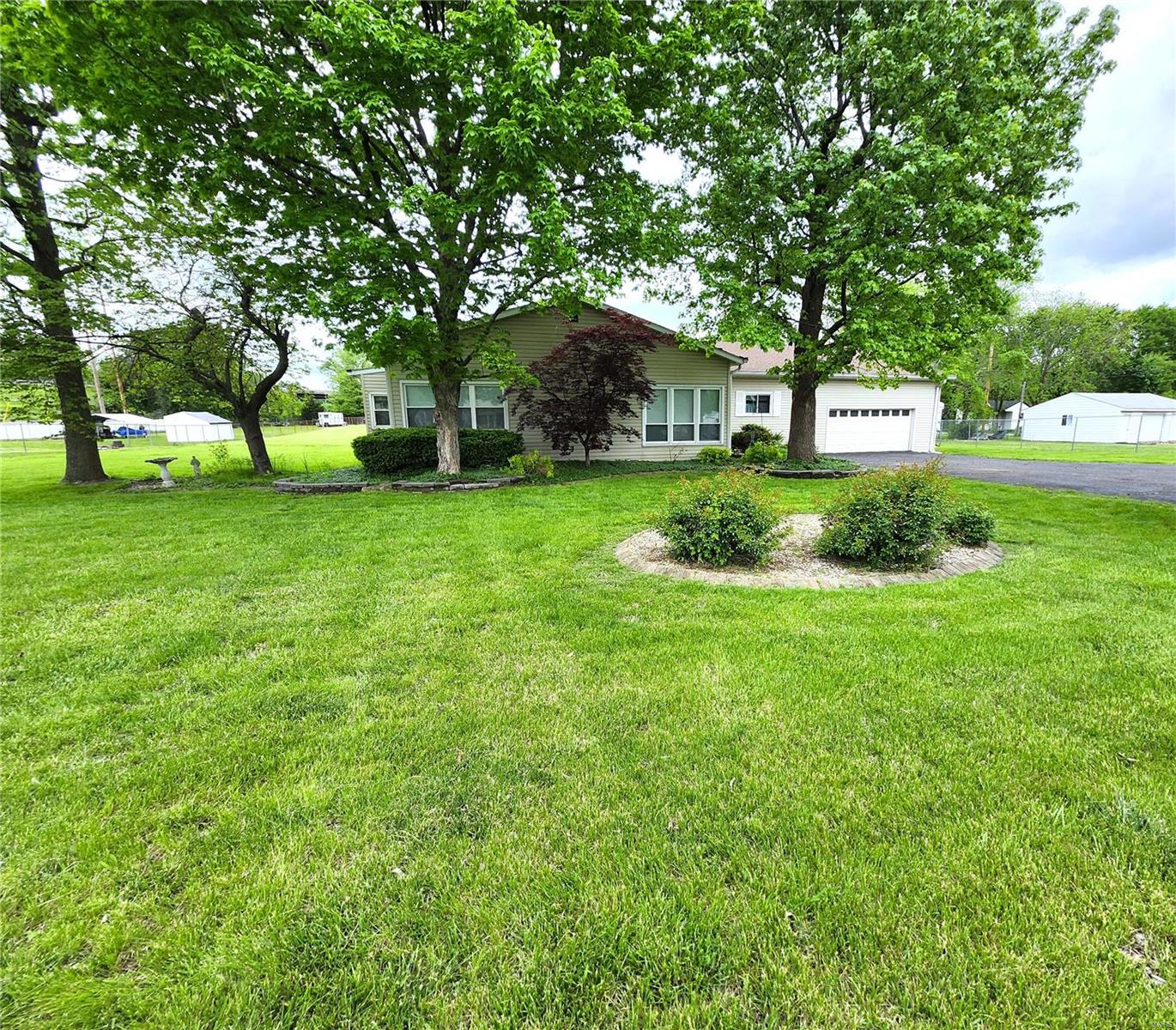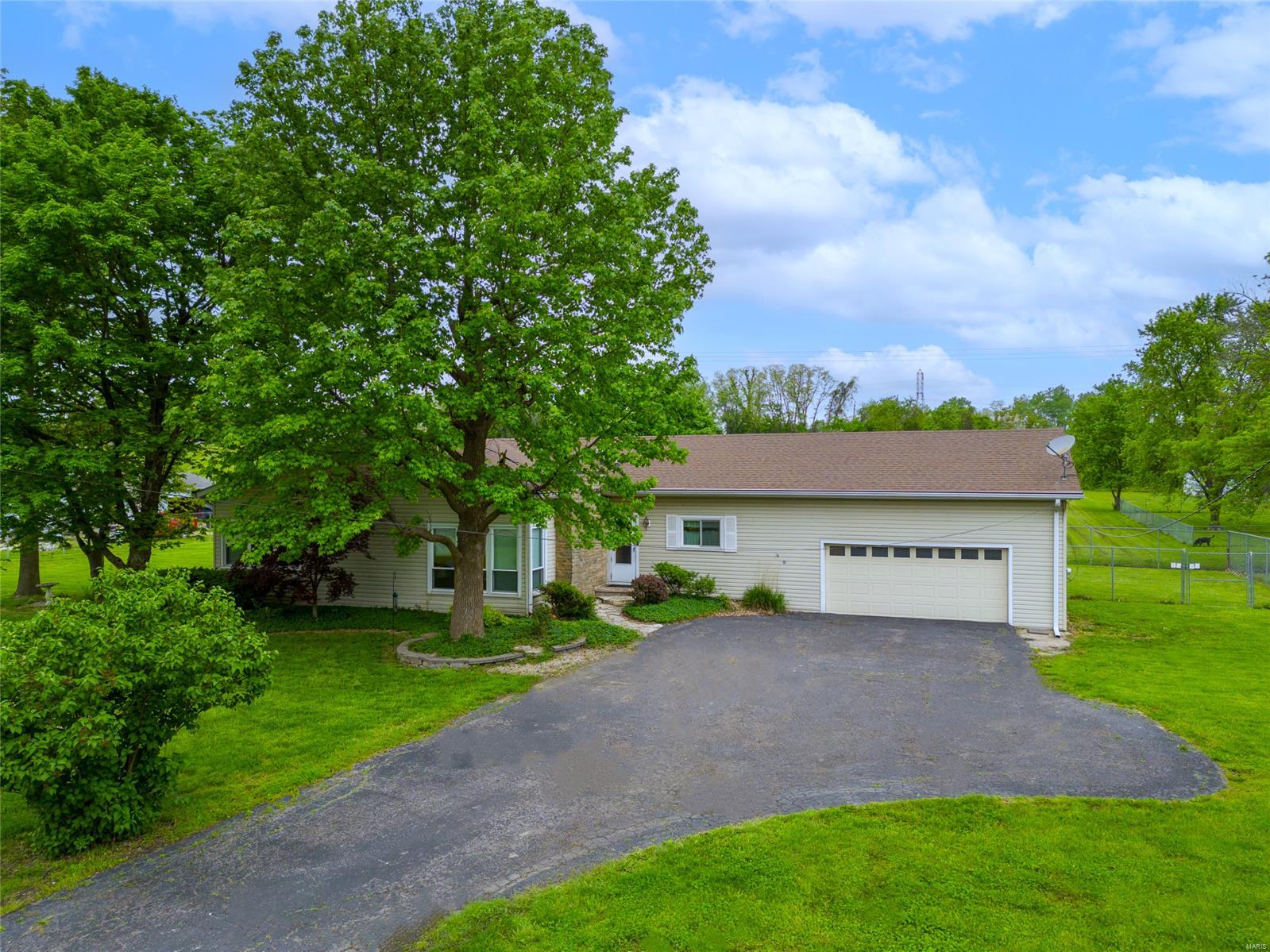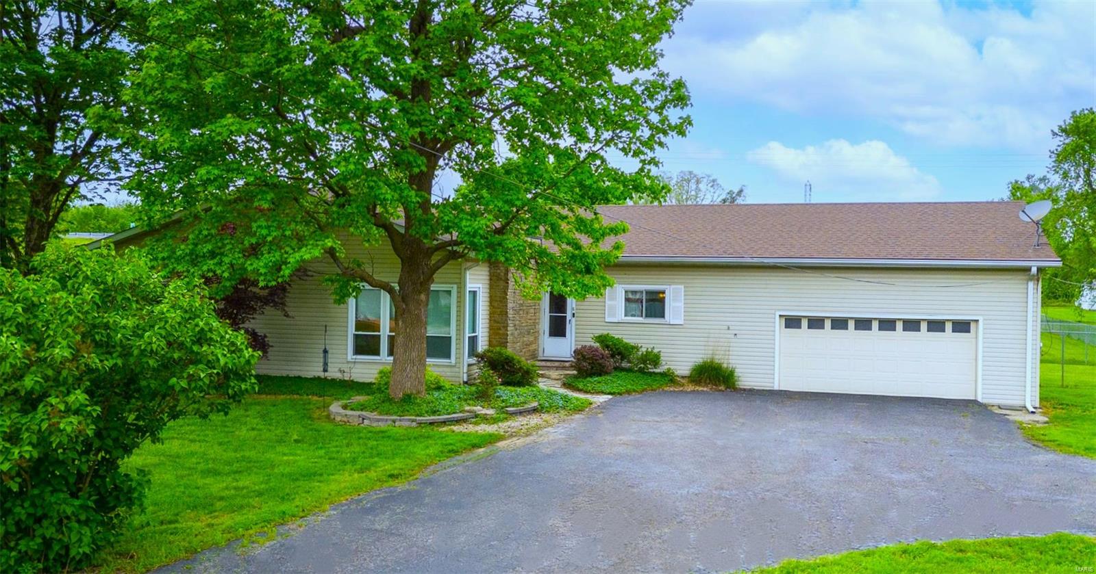 A rare find & rural vibes on the edge of town. 3 bed / 2 bath ~ 2,100 sq ft ranch sitting on a 2 acre lot. Two car attached over-sized Garage with a triple wide asphalt parking area. Everything is on one level. Main floor laundry - Washer & Dryer included. The Kitchen includes appliances, pantry closet, double sink & an abundance of cabinets. Separate Dining Room with hardwood floor. A unique feature of this home is the THREE gathering room options. A Living Room with hardwood floor & impressive, wood burning stone fireplace, a Family Room just off the kitchen, and a HUGE Great Room (26 x 16) on the back of the house. Convenient location near the intersection of IL-Route 162 and Route 111 can have you on the interstate in minutes. A backyard immediately behind the house is secured with a 6 ft tall fence, with the remaining acreage open beyond that. Vinyl Replacement windows. Roof - 10 yrs, Central Air - 2 yrs, Water Heater - 3 yrs. Selling As-Is but has already passed Occupancy.